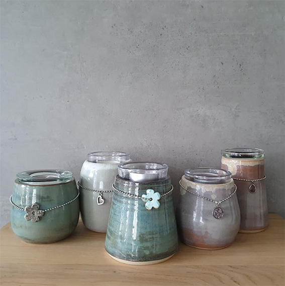 Urnen in verschillende doorsnedes en kleuren leverbaar.